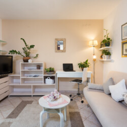 The apartment is designed to make you feel right at home. It features one cozy bedroom with a comfortable queen-size bed. The living room features a sofa bed that accommodates two additional guests, a flat-screen TV for entertainment, and a dedicated workspace, making it ideal for those who combine leisure with remote work.