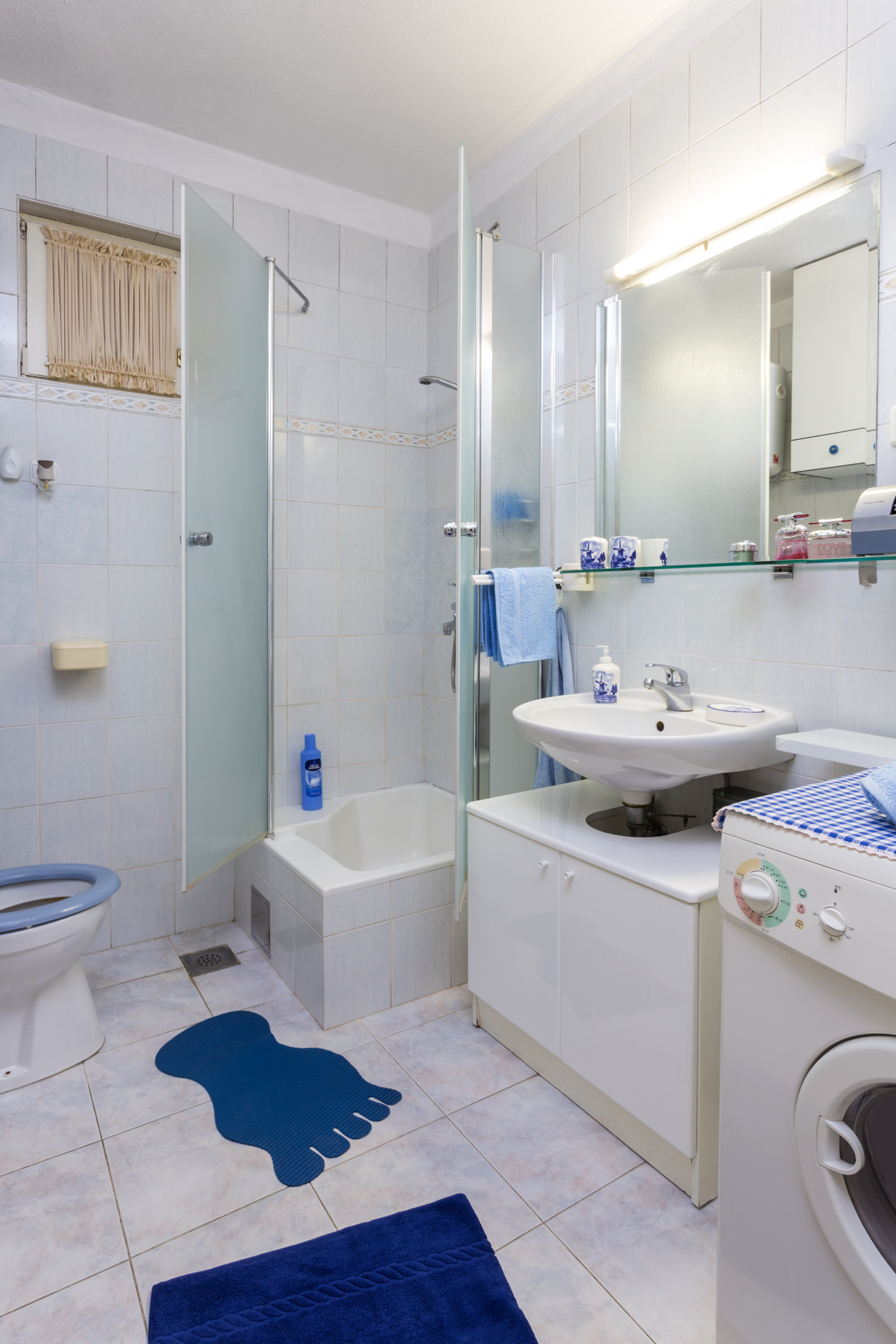 The bathroom includes a walk-in shower and a washing machine for your convenience. Fresh towels, linens, and basic toiletries are provided.