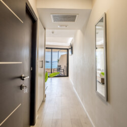 Guests can access their private rooms and shared areas, including the front desk waiting area with a balcony seating space overlooking the promenade and the sea. A rollaway/extra bed, baby cot, washing machine, iron, and ironing facilities are available upon request.