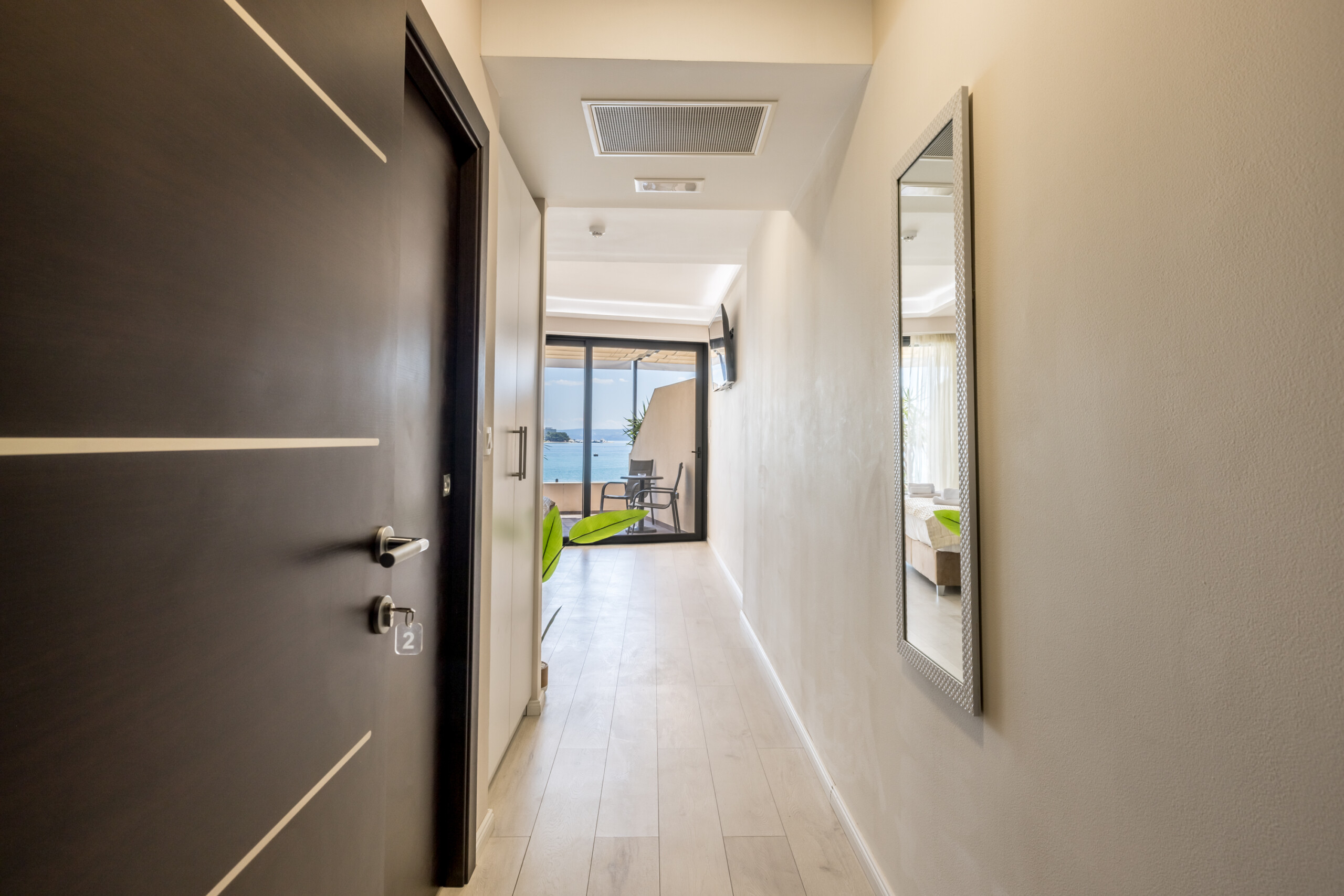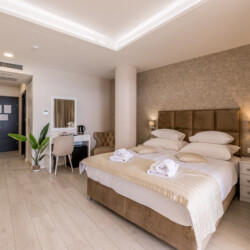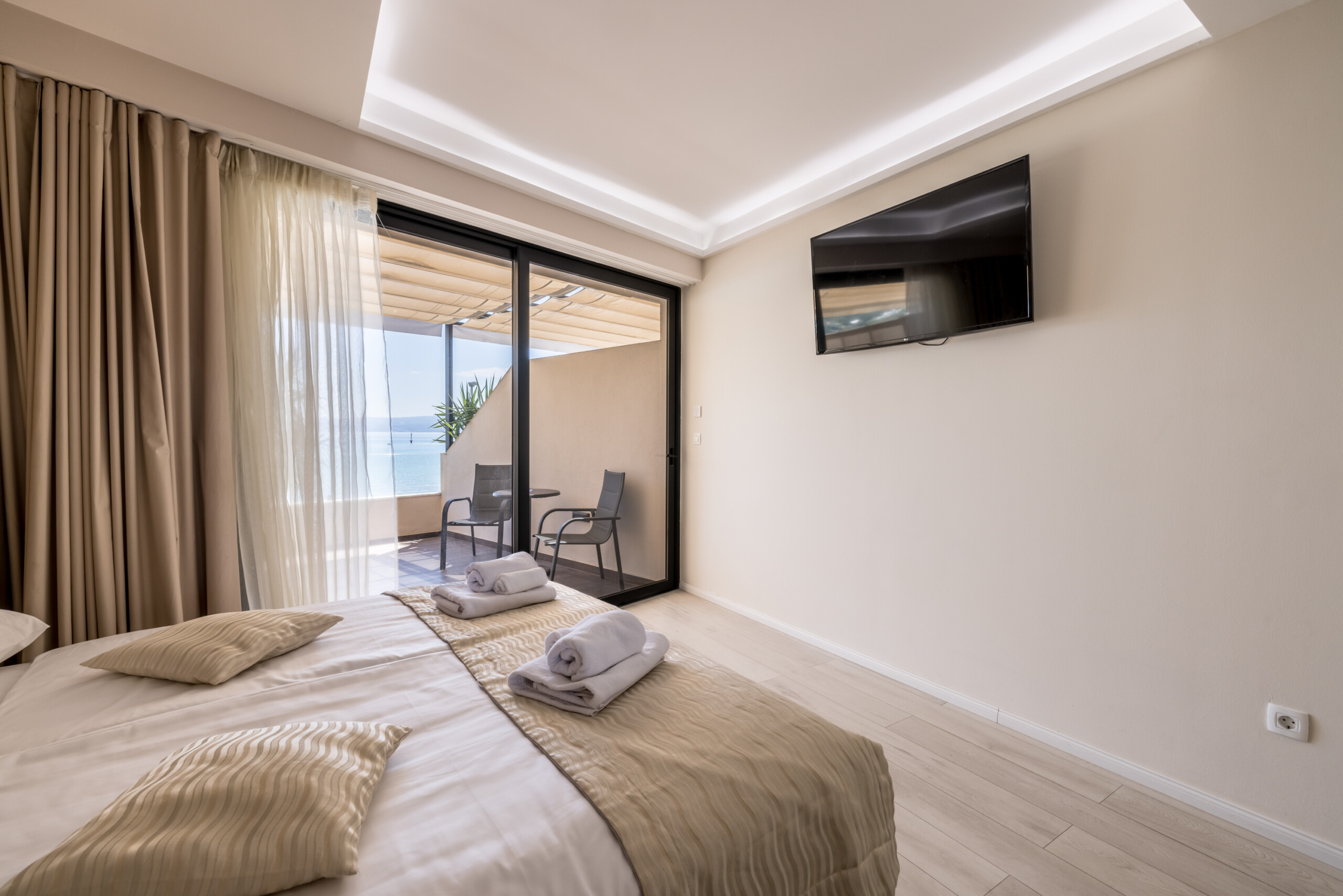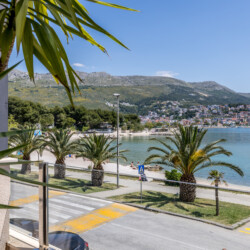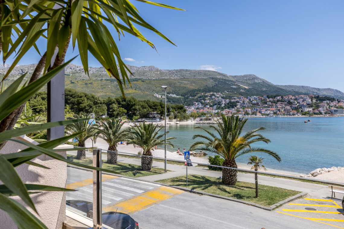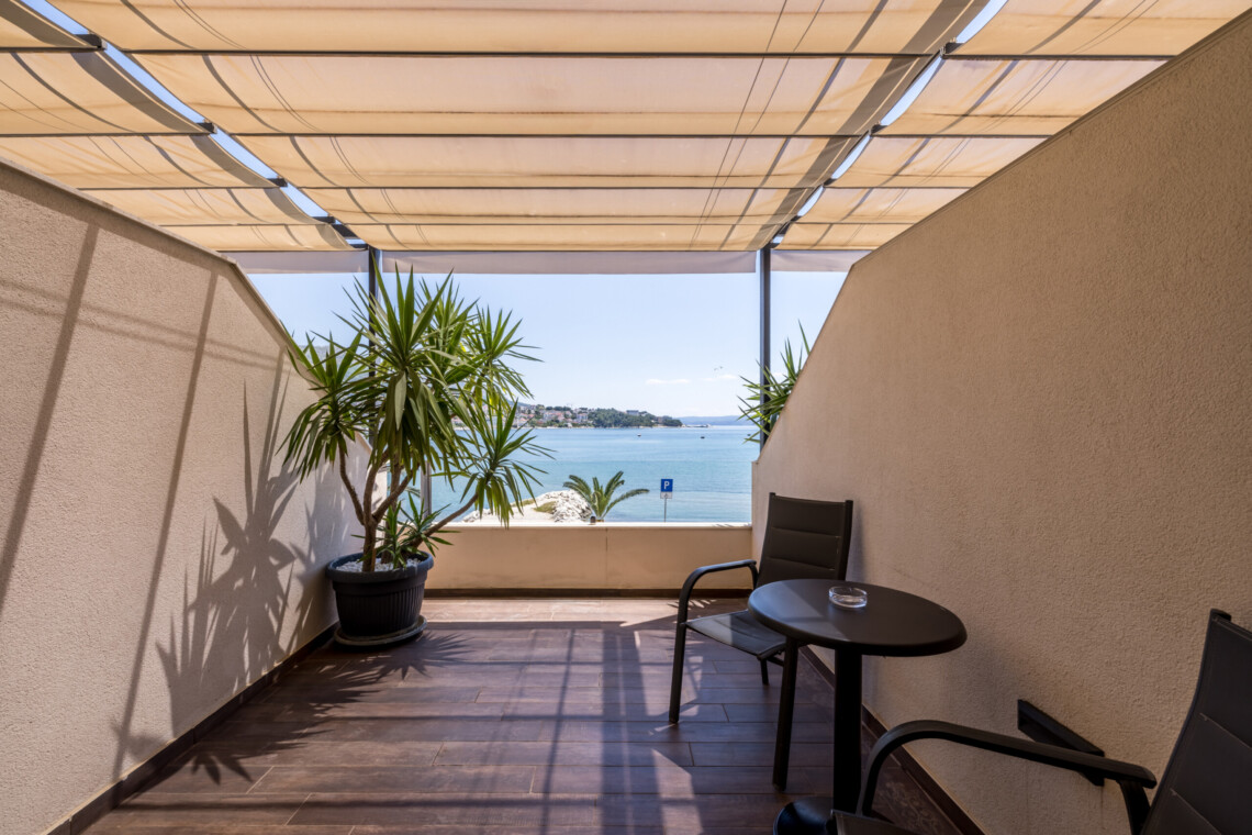 Wake up to breathtaking sea views at Luxury Rooms “Seven of Nine”, a stylish beachfront retreat in Stobreč, Croatia. This elegant room features a queen-size bed, warm modern decor, and a private balcony overlooking the stunning bay. It’s the perfect escape for relaxation and adventure. Just steps from the beach, it is surrounded by top restaurants, shops, and activities like tennis, golf, kayaking, and boat trips.