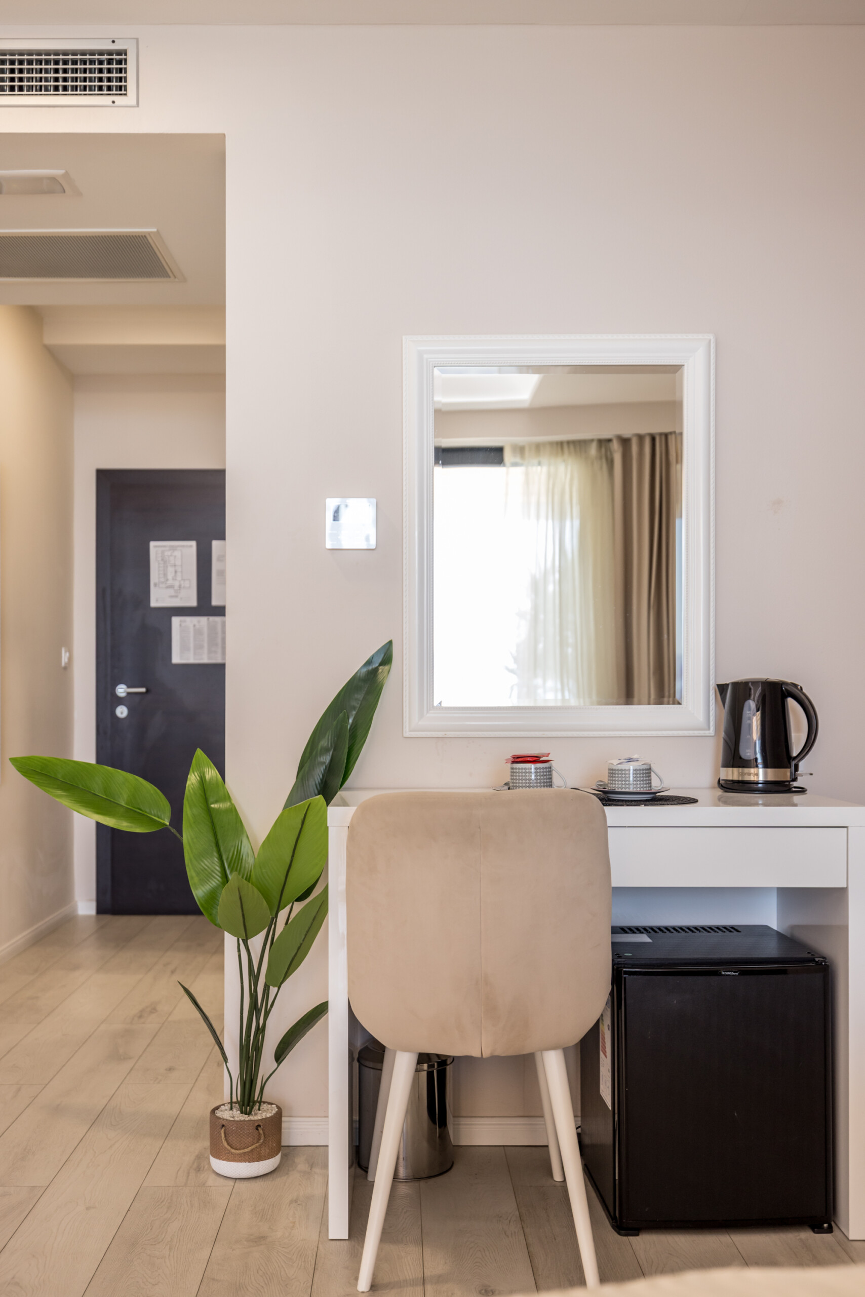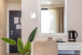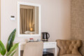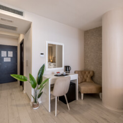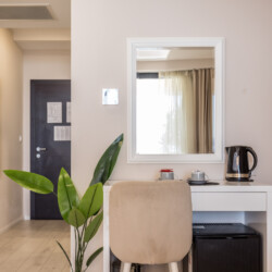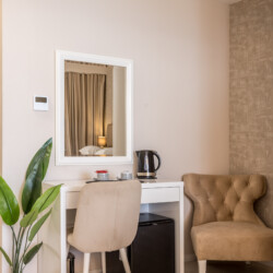 Inside, you’ll find a comfortable queen-size bed, a modern bathroom with a walk-in shower, and a dedicated workspace for planning or working. The room also includes air conditioning, high-speed Wi-Fi, a tea station with an electric kettle, and complimentary teas – everything you need for a peaceful and effortless stay.