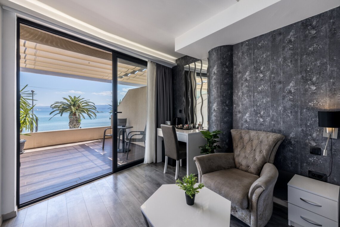 Wake up to breathtaking sea views at Luxury Rooms “Seven of Nine”, a stylish beachfront retreat in Stobreč, Croatia. This elegant room features a queen-size bed, warm modern decor, and a private balcony overlooking the stunning bay. It’s the perfect escape for relaxation and adventure. Just steps from the beach, it is surrounded by top restaurants, shops, and activities like tennis, golf, kayaking, and boat trips.
