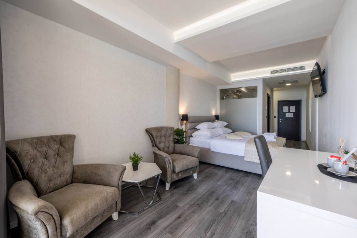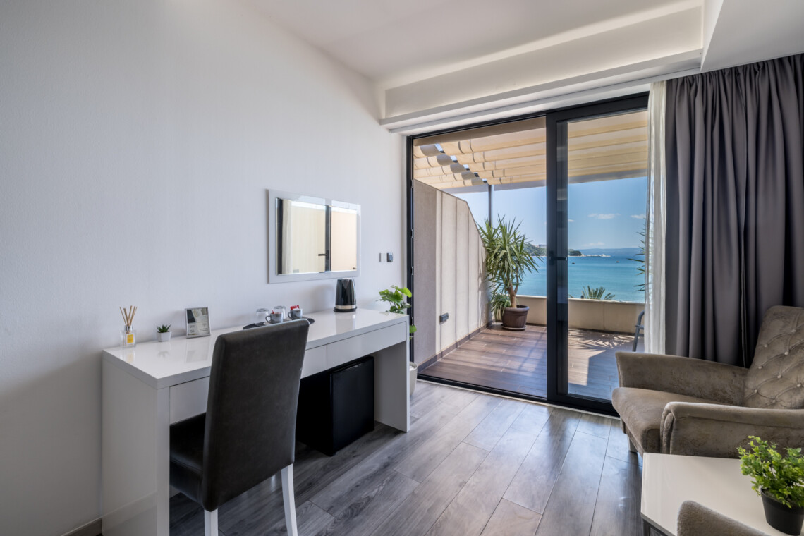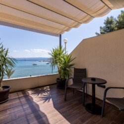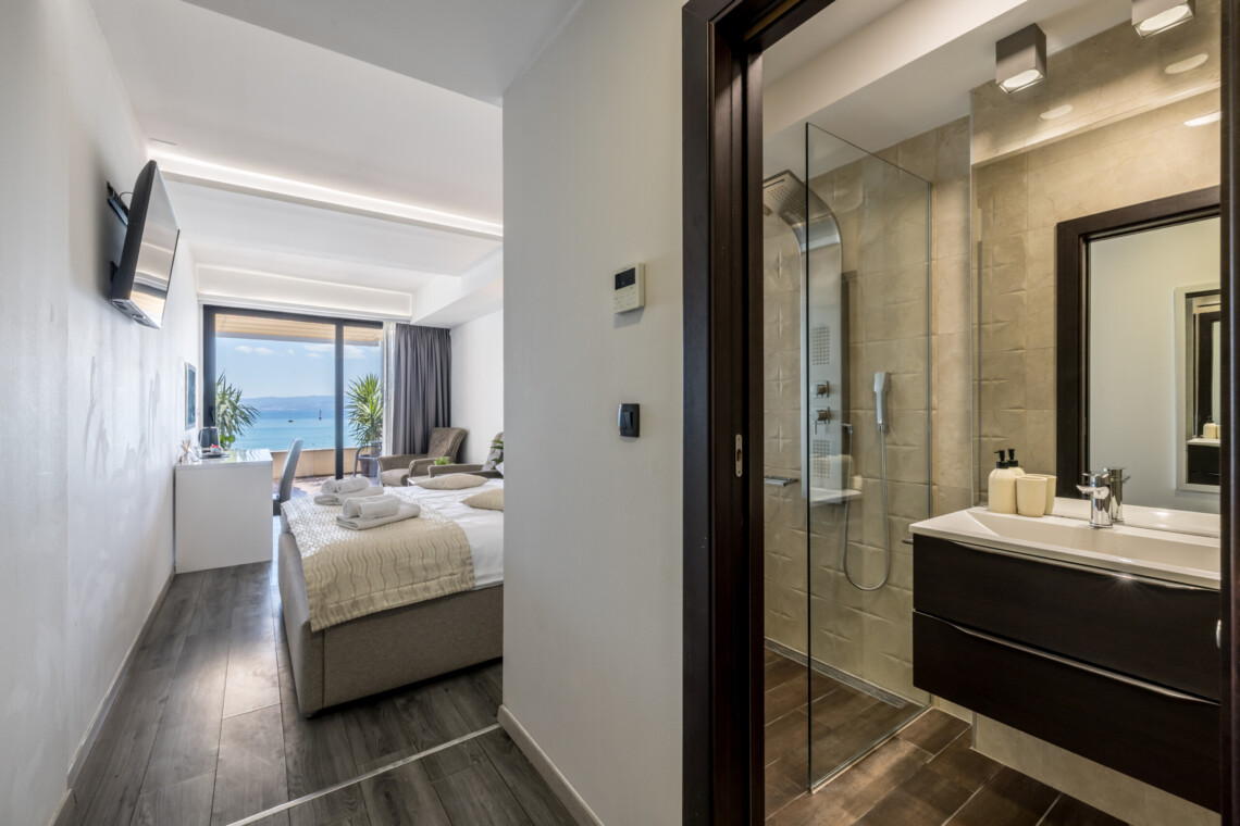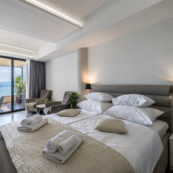 Wake up to breathtaking sea views at Luxury Rooms “Seven of Nine”, a stylish beachfront retreat in Stobreč, Croatia. This elegant room features a queen-size bed, warm modern decor, and a private balcony overlooking the stunning bay. It’s the perfect escape for relaxation and adventure. Just steps from the beach, it is surrounded by top restaurants, shops, and activities like tennis, golf, kayaking, and boat trips.