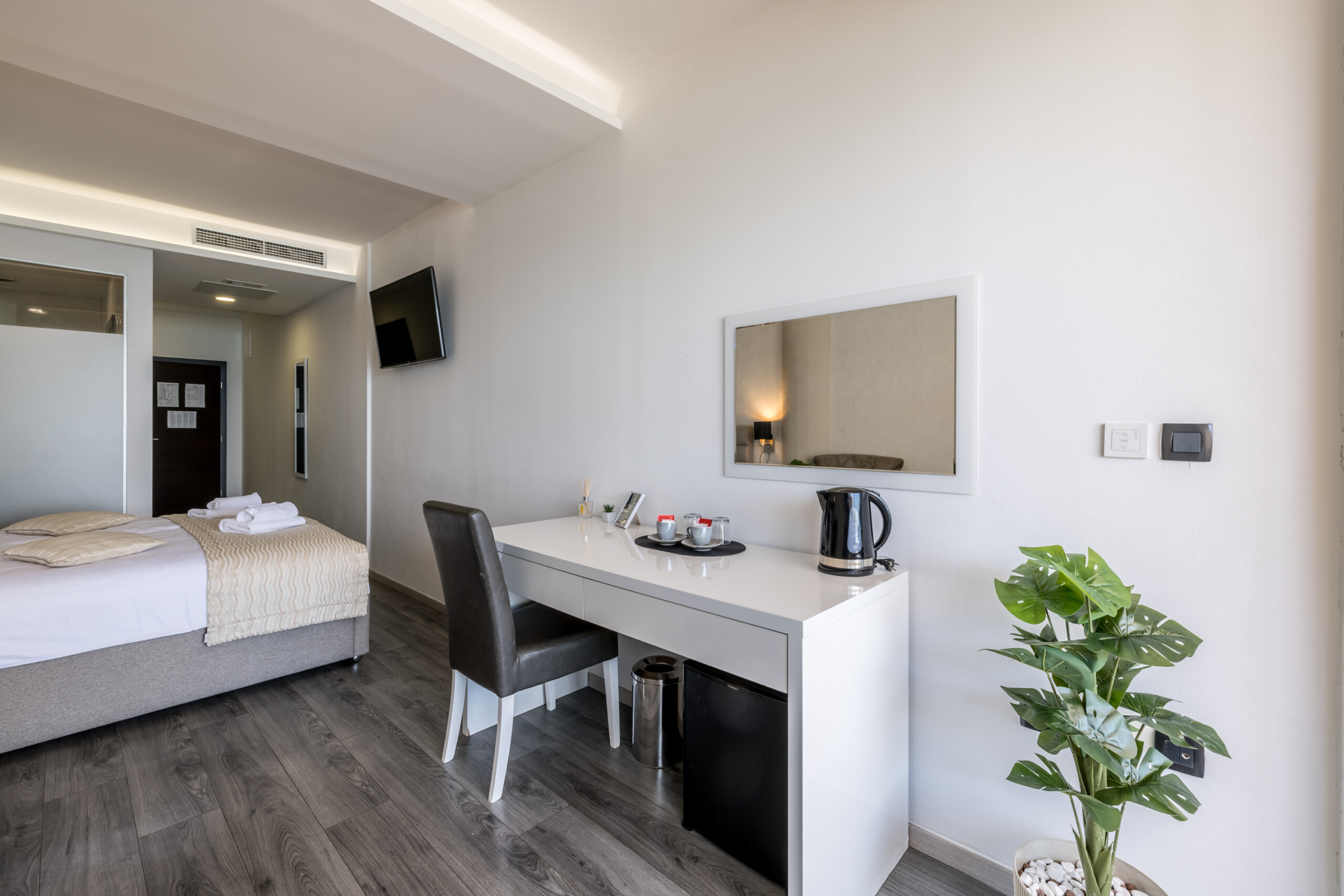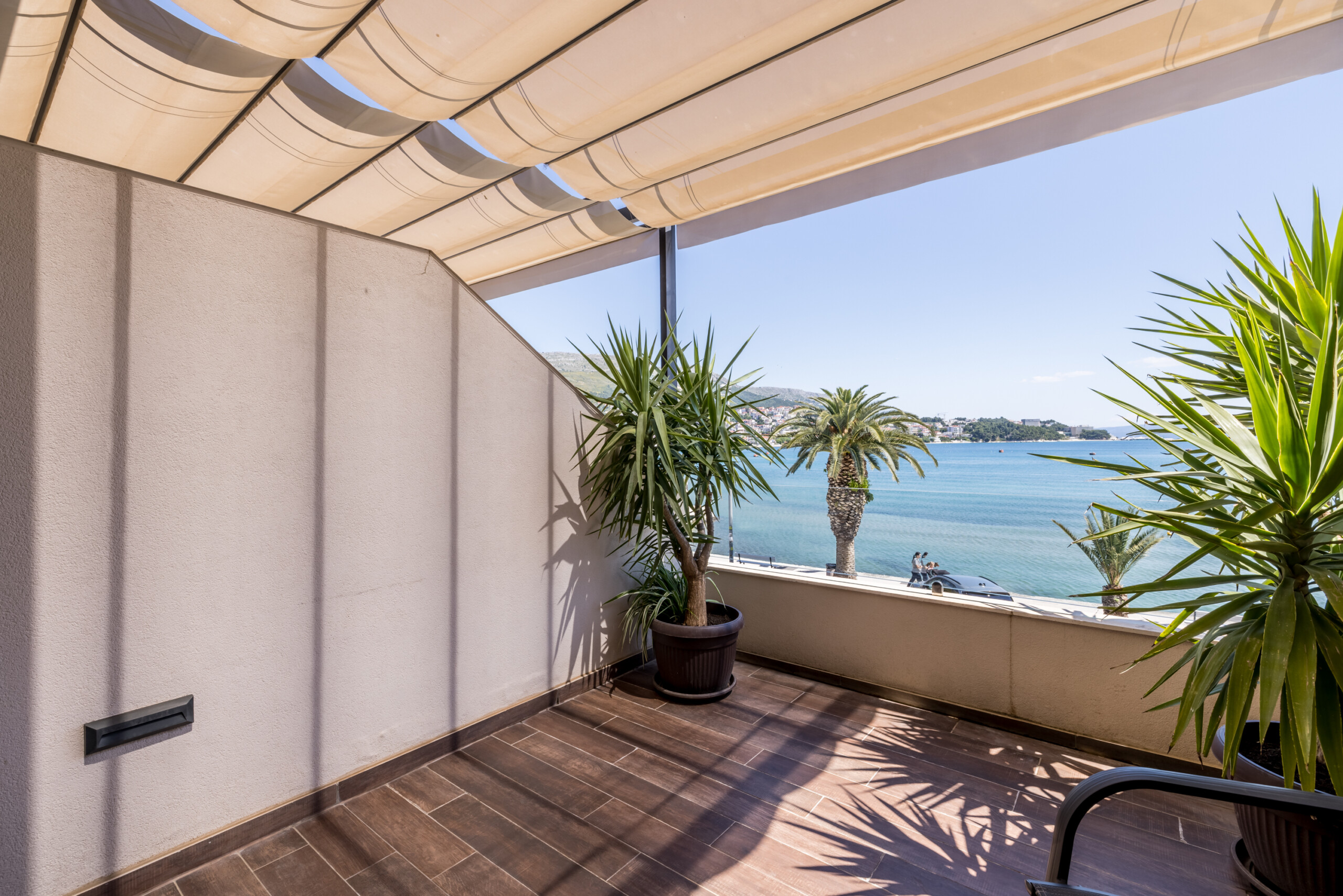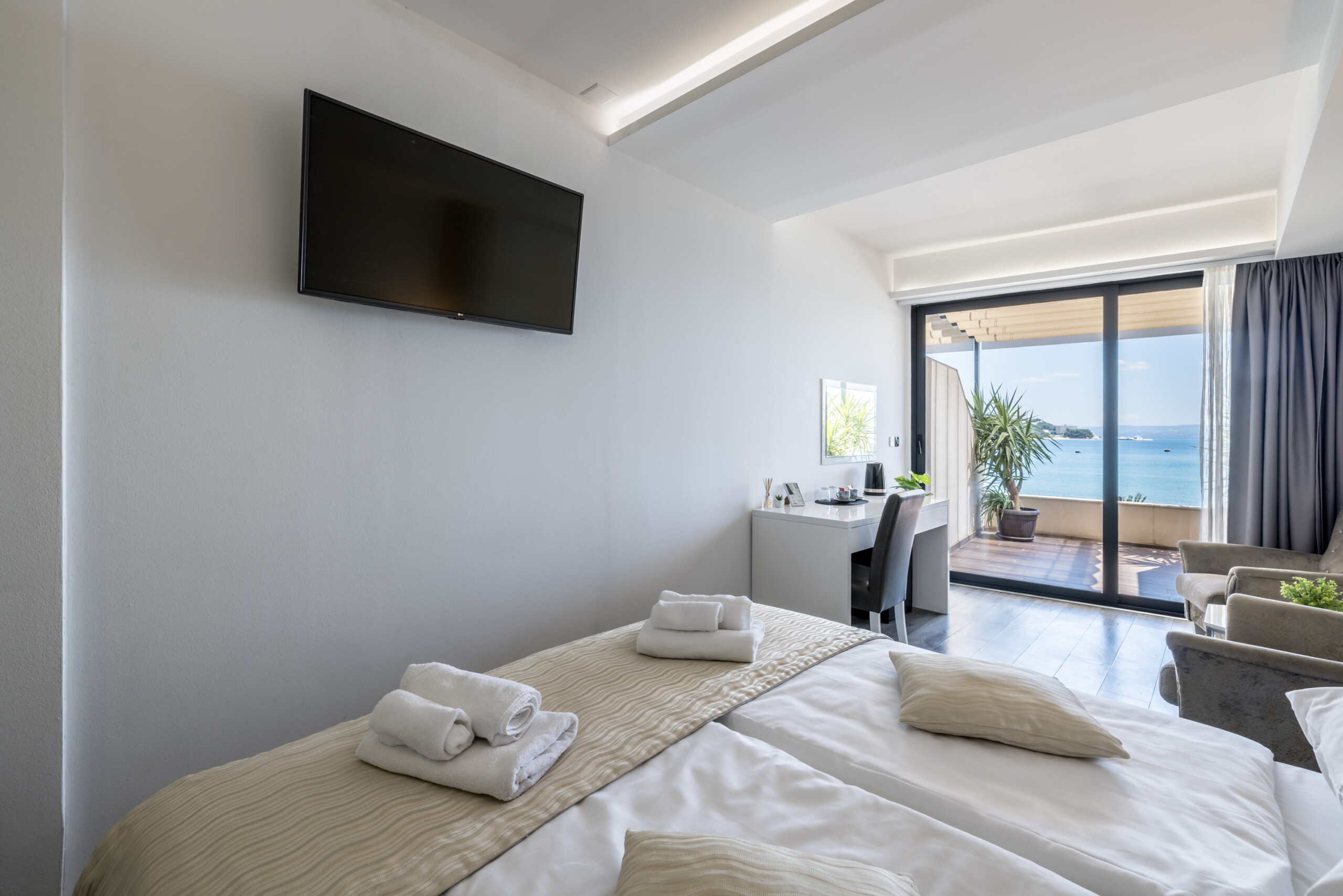 Wake up to breathtaking sea views at Luxury Rooms “Seven of Nine”, a stylish beachfront retreat in Stobreč, Croatia. This elegant room features a queen-size bed, warm modern decor, and a private balcony overlooking the stunning bay. It’s the perfect escape for relaxation and adventure. Just steps from the beach, it is surrounded by top restaurants, shops, and activities like tennis, golf, kayaking, and boat trips.