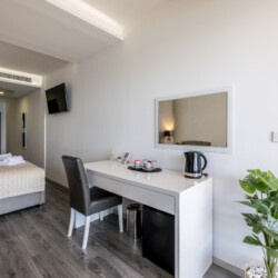 Inside, you’ll find a queen-size bed, a modern bathroom with a walk-in shower, air conditioning, and fast Wi-Fi. A dedicated work desk is ideal for trip planning or remote work, and the tea station, complete with an electric kettle and complimentary teas, adds an extra touch of comfort.