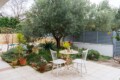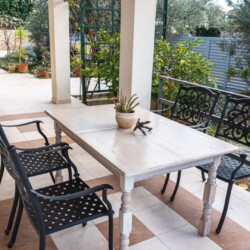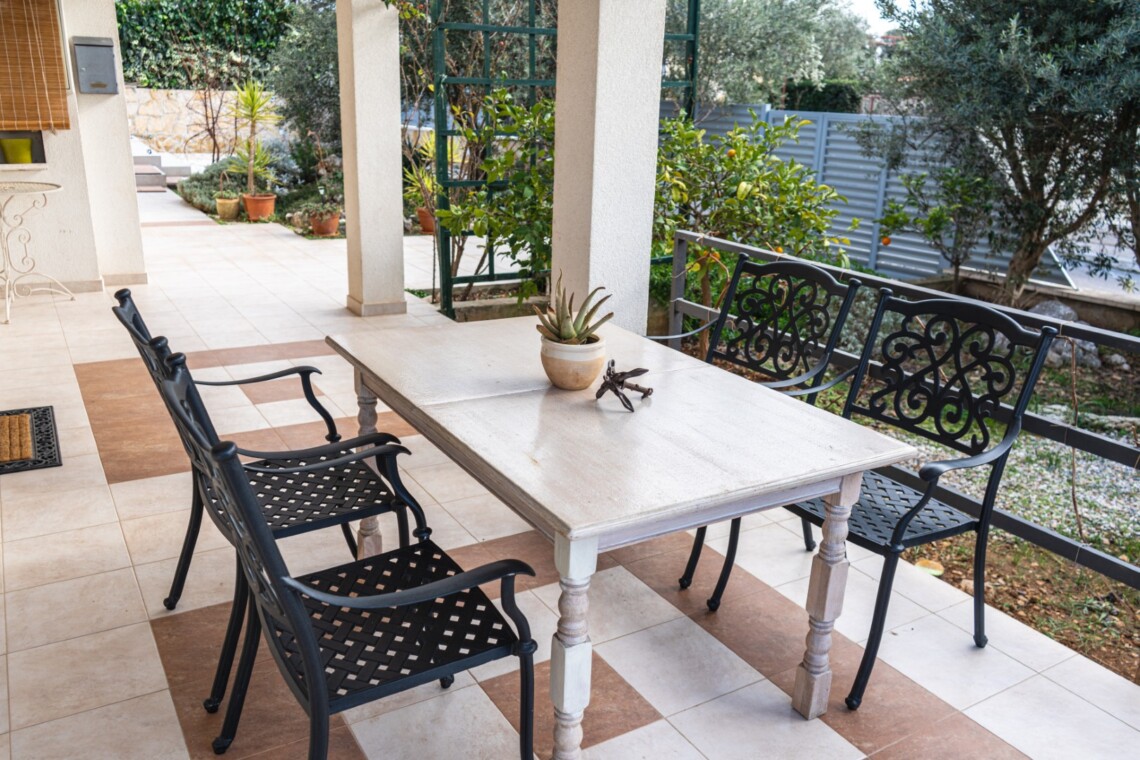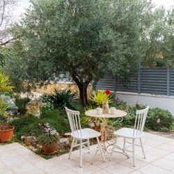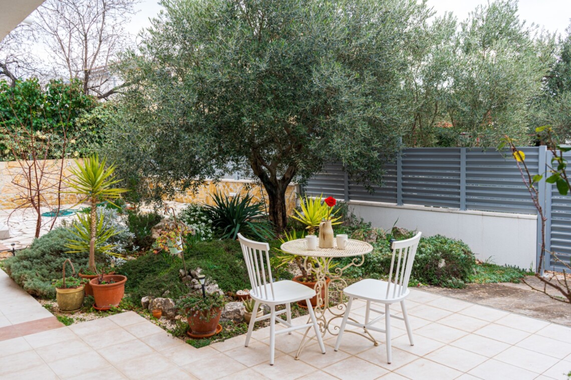 This apartment features a spacious terrace with a dining table, creating a lovely spot for outdoor meals. Guests also have access to the beautifully maintained garden surrounding the property.
