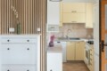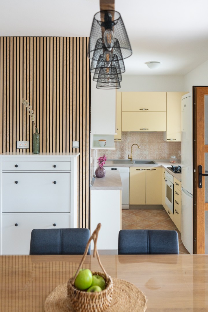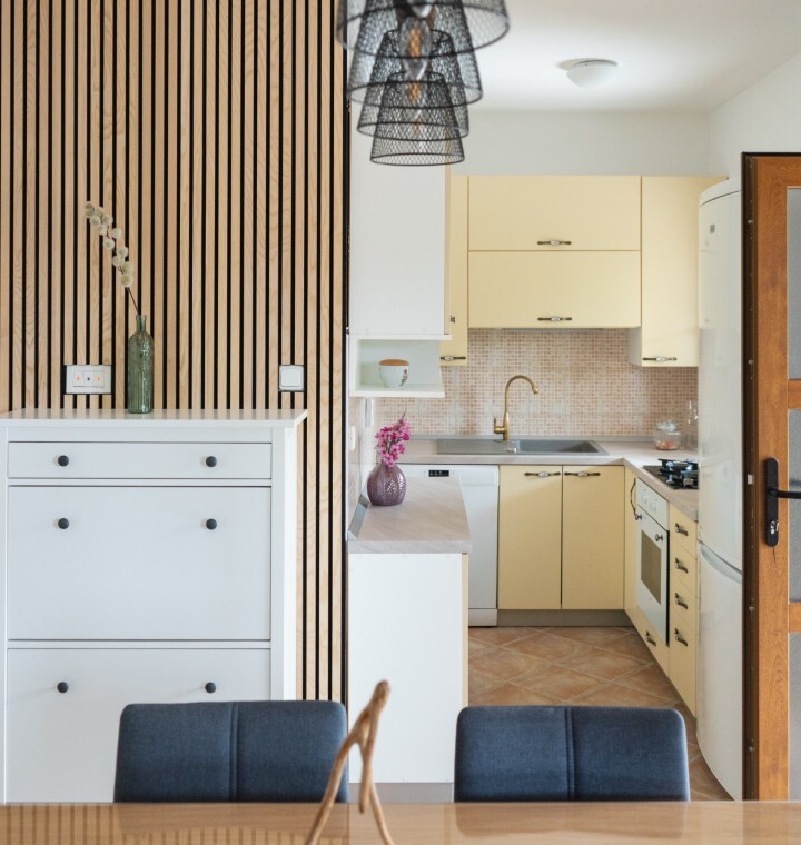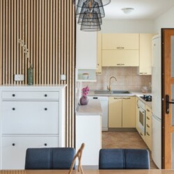 The apartment includes a living room with a TV, a dining area, and a fully equipped kitchen with a dishwasher. The bathroom has a shower cabin for your convenience.